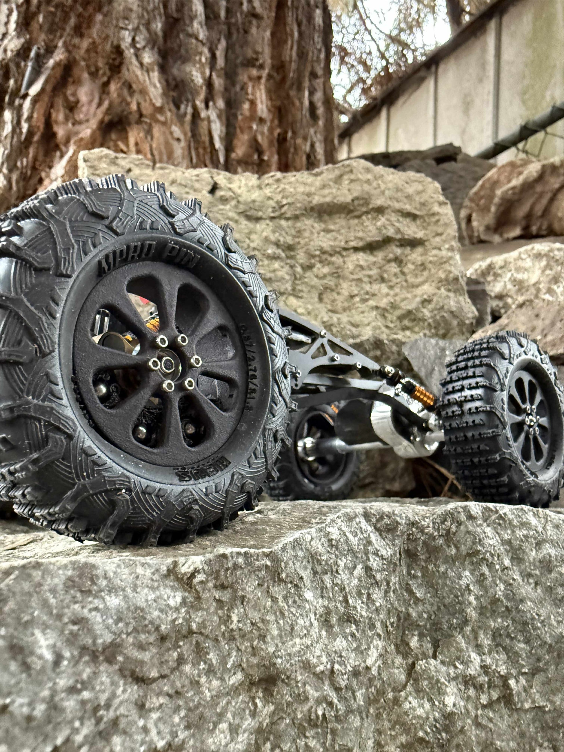 These are the smallest you can get a micro wheel and still fit a LCG weight hanger. Making the wheel as small as possible gives the most sidewall, which in turn gives more sidewall flex allowing the tire to conform and grip the rocks better. Using an ultra high clearance glue on design allows for the clearance to fit LCG style weights with 14 tungsten balls.