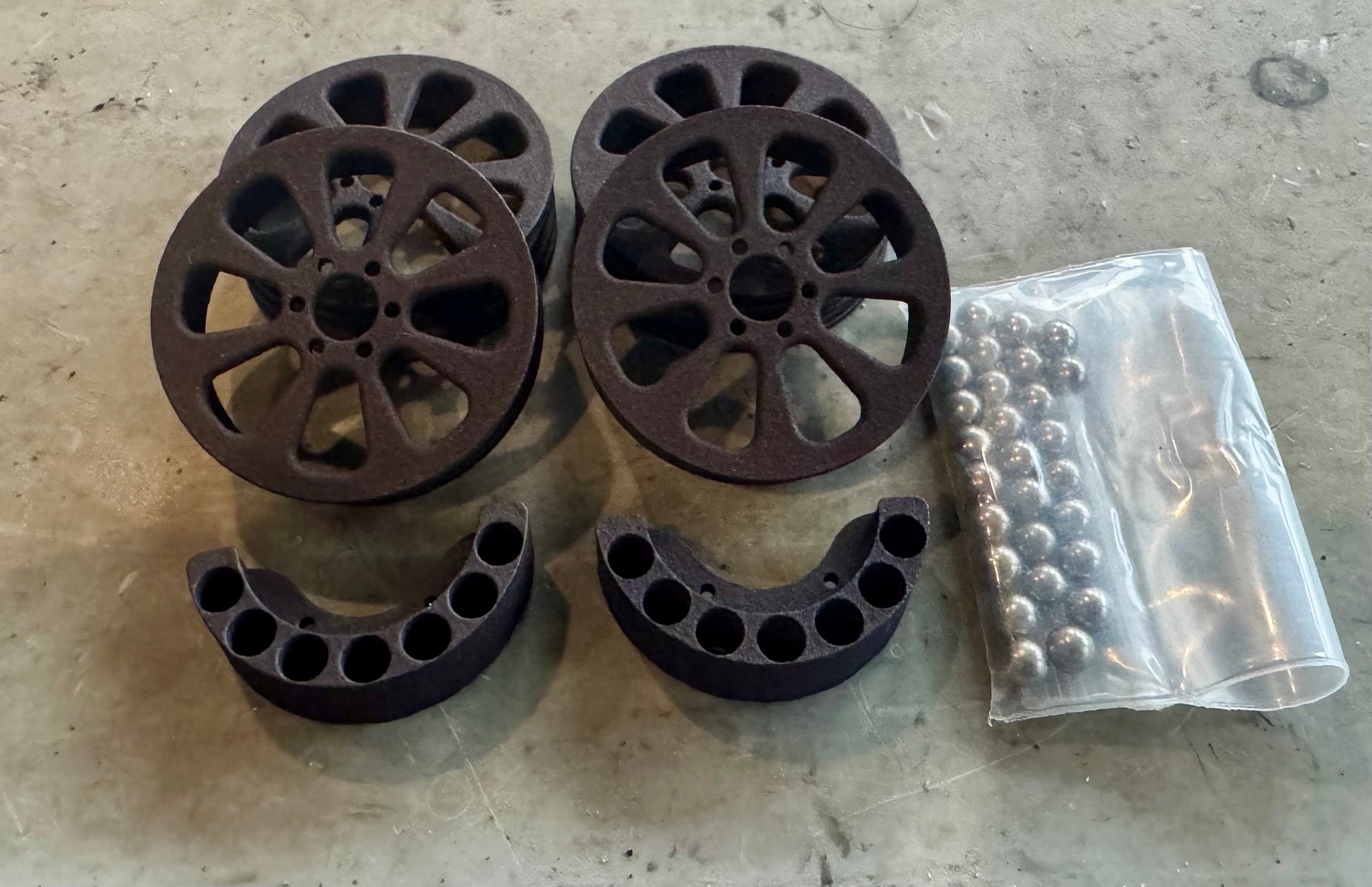 Kit includes 4 wheels, 2 knuckle weight hangers and 28 tungsten balls.